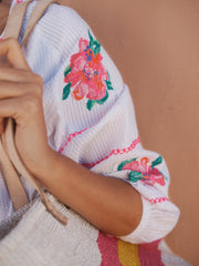 For the embroidery, we redesigned the peony into a cross-stitch pattern that resonated with Gayle and our love of unique needlework. We transformed the design into various sizes, tactically placing them and paired it with cross stitching to trim the edges. Tying in the warm hues of the wild peony print, we paired the embroidery with a rich geranium shade for the linen Petra and Deia, then contrasted in white with Leonie & Alba making the peonies pop.